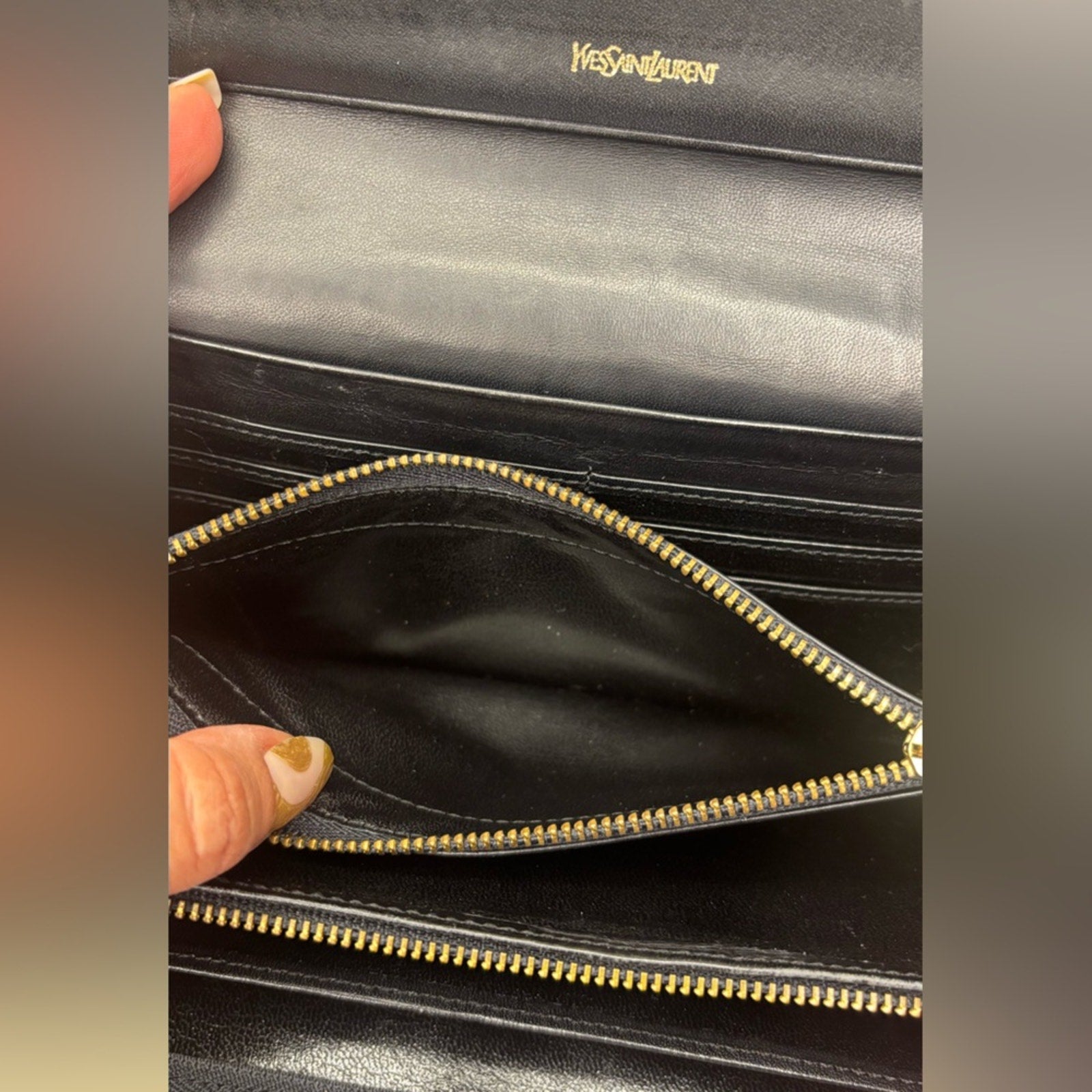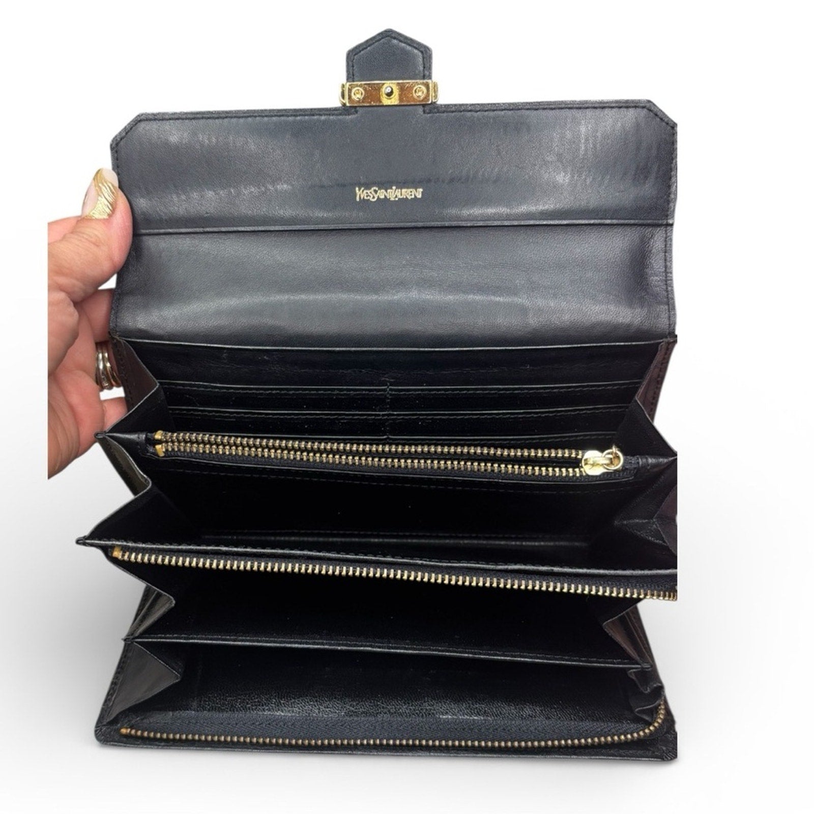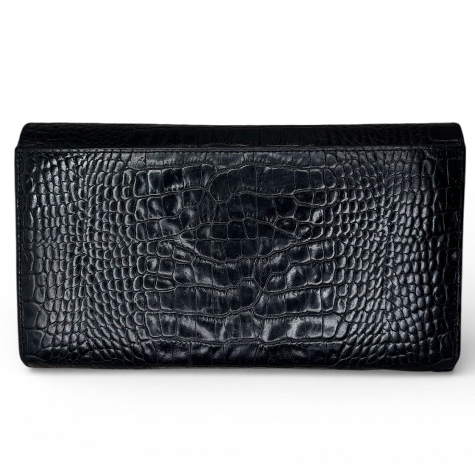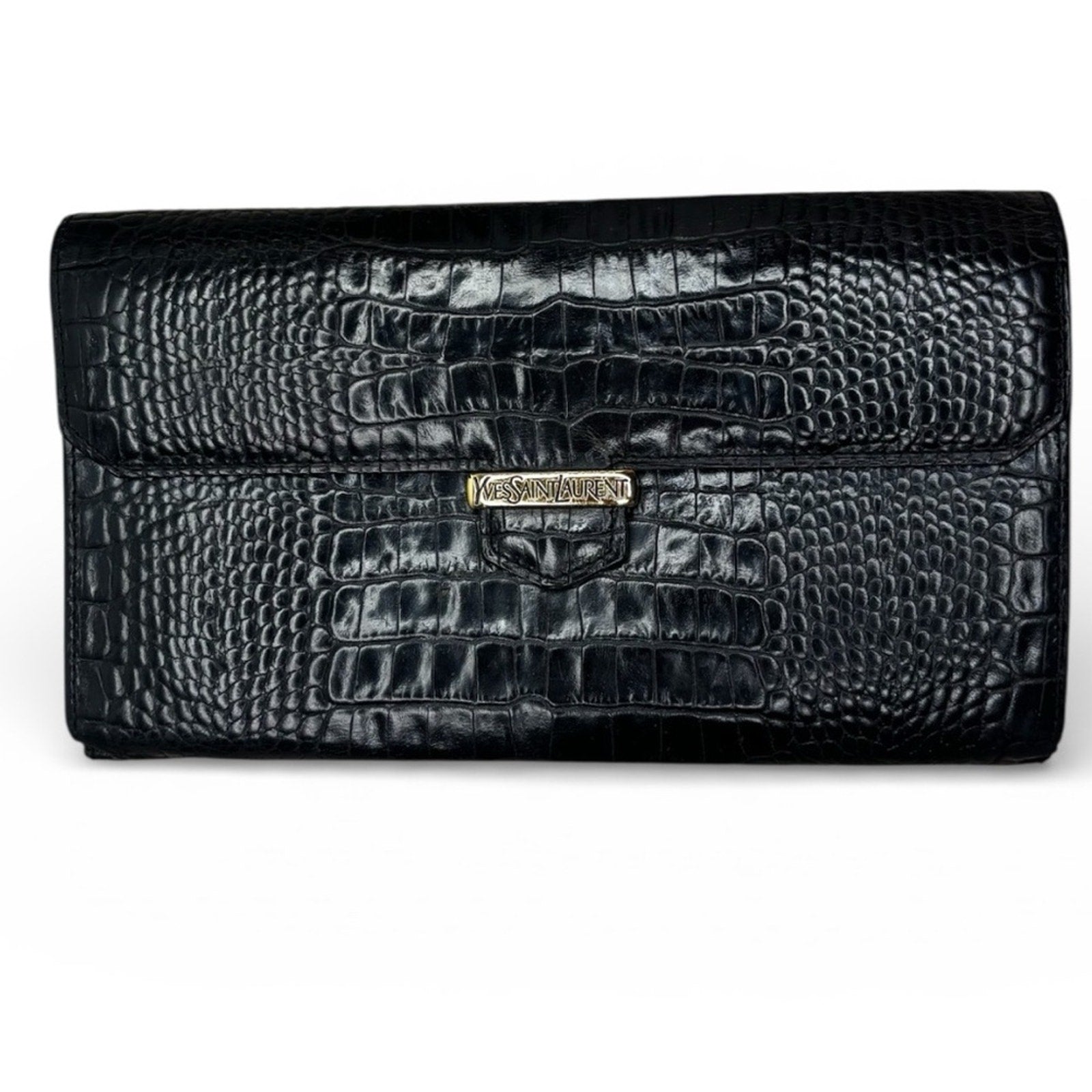pre-owned Yves Saint Laurent Crocodile Embossed Leather Long Bifold Wallet. The over all is very good condition,